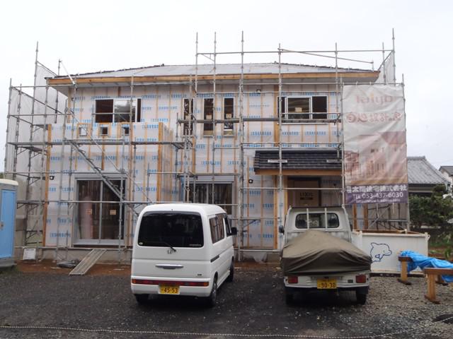 ・木工事、2階壁断熱材入れを進め、床材が納品され床フローリング 貼りを行っていきます。 ・屋根工事、パネル設置し廻りの瓦を納めます。29日ユニットバス 据付、外壁工事に入ります。