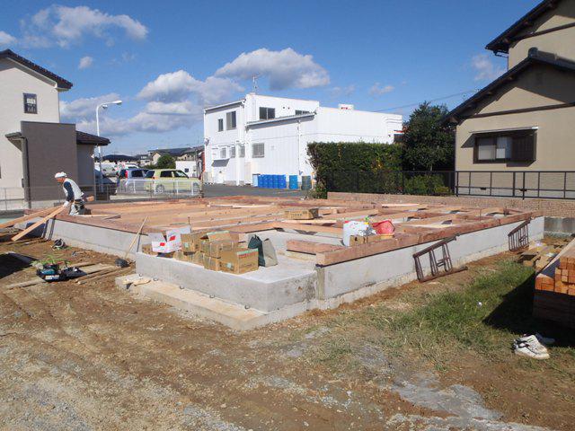 上棟に向け、土台据え、床下地組み、構造、下地材搬入と