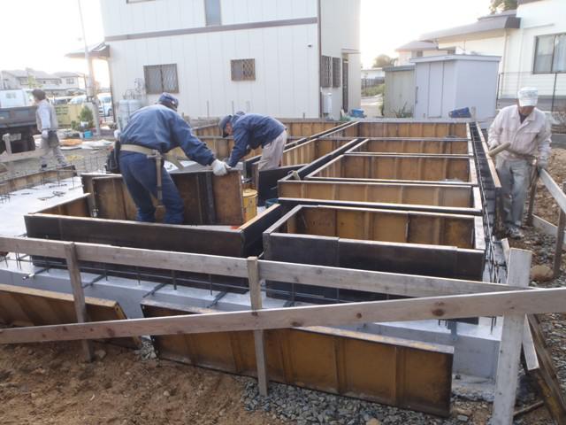 配筋検査後、ベースコンクリート打ちをし立ち上がり部、型枠組みを