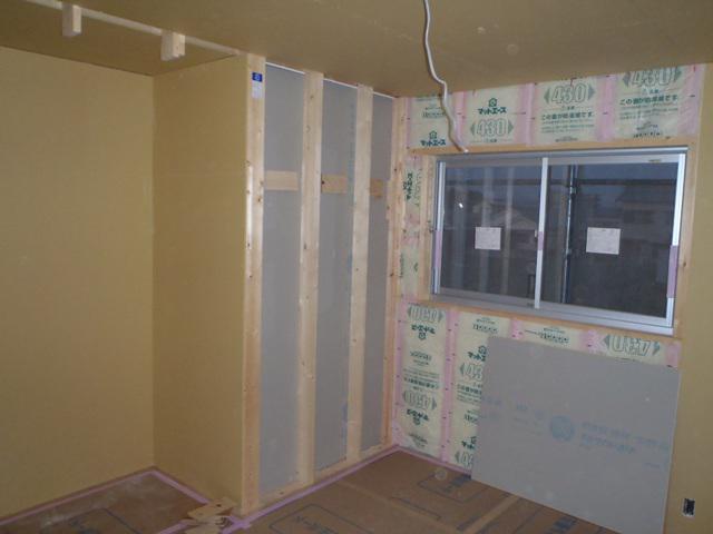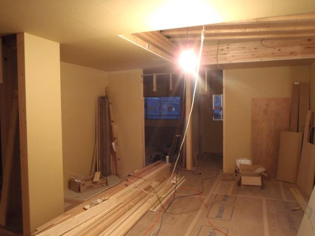 ・内部木工事、1階床フローリング貼りを終え、間仕切り壁ボード