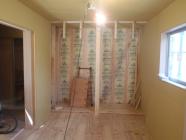 ・木工事、1階窓枠・ドア開口枠を取付ながら、壁ボード貼りを