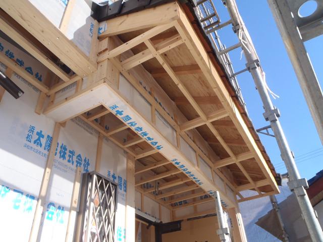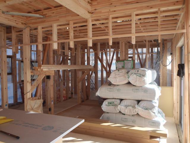 ・木工事、外壁下地材打ち、軒天下地組み、2階天井 ボード貼り、断熱材入れを行っています。内部給排水、電気 配線なども進めています。 ・当社冬季休暇を28日より1月5日まで頂きます。