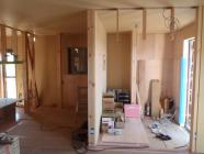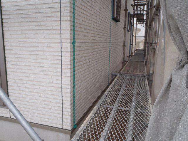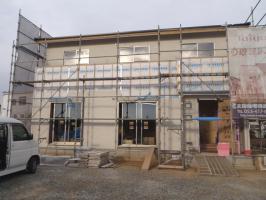 ・外激サイディング貼りが完了し、コーキング打ちを進めています。 コーキング材乾き次第軒天塗装に入ります。 ・内部木工事、1階床フローリング貼り、窓枠取付、壁ボード 下地合板貼り絵を進めています。