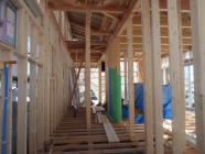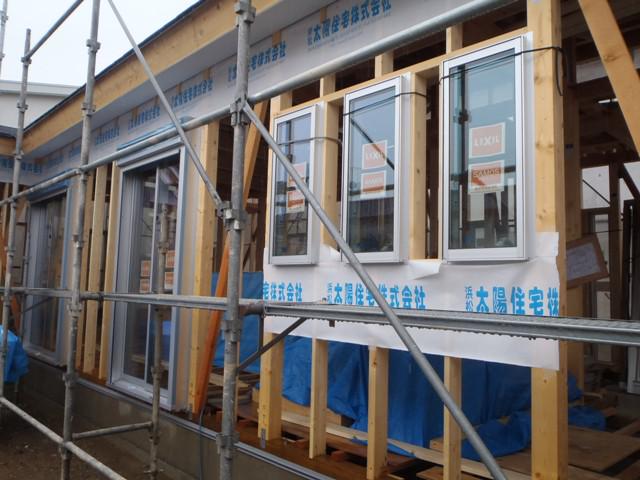 ・木工事、窓サッシ、玄関ドア取付を行っています、取付後、 外壁下地シート貼り床断熱材入れ、本締めと進めていきます。 ・29日保証機構、外装下地検査(外壁下地シートの基準施工 状況、シート貫通部の防水処理状況)受けます。