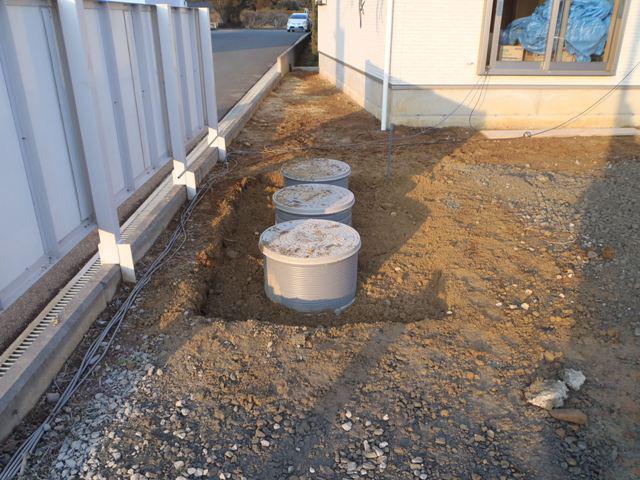 ・外部足場が解体され、建物外観がよく確認出来るようになり ました。浄化槽設置・外部給排水埋設と進めています。 ・内部木工事、ドア枠取付ながら壁ボード貼りが進み、各部屋 が間仕切られ、家具等のレイアウトなど、寸法が確認出来ます。
