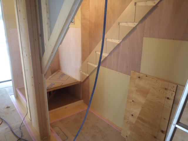 ・外部工事、軒天塗装、板金・トイ掛けが完了しました。 外部換気扇フード類、TVアンテナ取付を進めています。 ・内部木工事、ドア開口枠を取付2階より、幅木・廻し縁及び 棚類取付、階段造作を進めています。 10日、キッチン据付が完了しました。