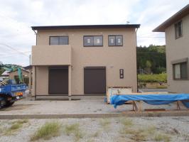 ・外部足場が解体され、建物外観がよく確認出来るようになり ました。浄化槽設置し、外部給排水・給湯埋設を進めていき ます。 ・内部木工事、建具吊込み、カウンター・笠木木材取付し完了と なり内装仕上げ工事へと進めていきます。