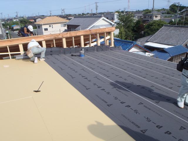 ・上棟おめでとうございます。天候に恵まれ予定工事が無事 完了し、上棟式・餅投げには多くの方にお集まり頂きま した。 ・屋根ガルバニウム鋼板を葺き上げ、役物板金(棟包み・壁際 板金)行っていきます。 ・木工事、筋カイ・間柱入れ、構造金物取付、1・2階床下地と 進めています。