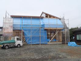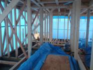 ・7月に入ってから雨が続き、構造・下地材を濡らさぬ様に ブルーシートをかけ、木工事・構造金物取付、2階床下地及び 下地合板本締め、ベランダ下地と行っています。 ・一部窓サッシが搬入され、サッシ開口等にも取り掛かって います。