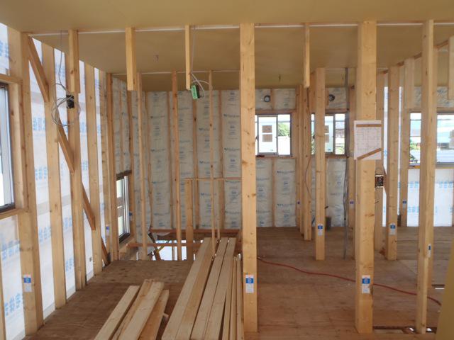 ☆先週の工事☆ 木工事(軒天下地組み及び軒天ケイカル板貼り、2階天井断熱材 入れ、及びボード貼り、他) 外壁工事(サイディング下地、サイディング貼り、他) ☆今週の予定工事☆ 木工事(1階天井ボード貼り、壁断熱材入れ・窓枠取付、他) 外壁工事(サイディング貼り、他)