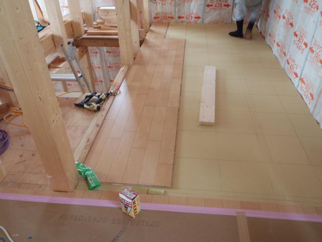 ・内部木工事、天井下地組み及びボード貼り、床フローリング貼りと