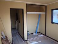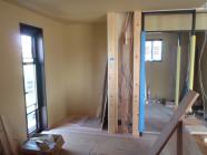 ・木工事、2階幅木・廻し縁、階段廻り造作を納め、建具 吊り込み残しとなりました。1階壁ボード貼り、幅木・ 廻し縁・固定棚取付、和室造作と進めていきます。 ・木工事完了まで残すところわずかとなっていきました。