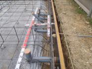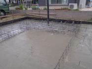 ・基礎工事、ベース型枠組み・鉄筋組みを終え、JIO保証機構、 配筋検査を受け、ベースコンクリートを打ち終えました。 ・布基礎部(土台を据える立ち上がり基礎)の方枠組み、アンカー ボルト類設置し、布基礎部コンクリート打ちを予定しています。