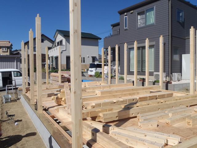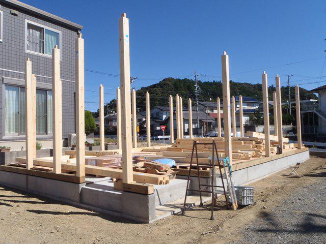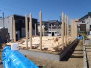 ・基礎工事が完了し、上棟準備へと入り土台据え、床下地組み、 2階貼り、柱、下地木材搬入し、外部足場組みを行い、いよ いよ上棟を迎えます。 ・上棟当日は、構造材を組み屋根下地まで進める予定です。