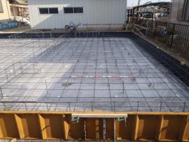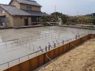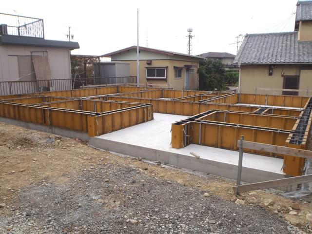 検査)を受け、ベースコンクリート打ち、立ち上がり型枠組み、アンカー