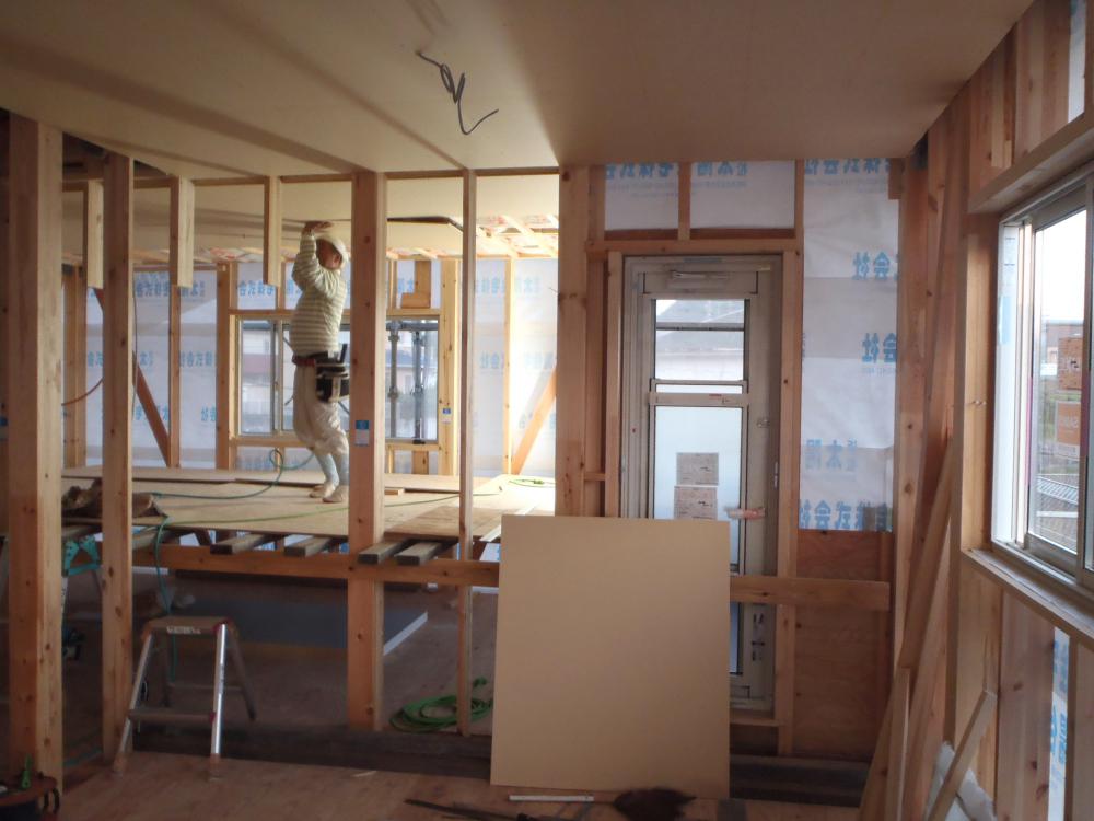 ☆先週の工事☆ 木工事(1階床断熱材入れ、及び下地合板本締め、2階天井 下地組み、及び断熱材入れ、ボード貼り、他) ☆今週の予定工事☆ 木工事(外壁下地材打ち、軒天下地組み及び軒天板貼り、 壁断熱材入れ、2階床下地ボード敷き、他) 保証機構JIO 、外装下地検査