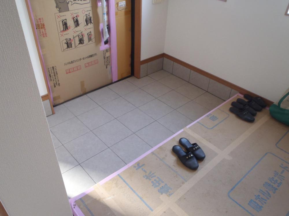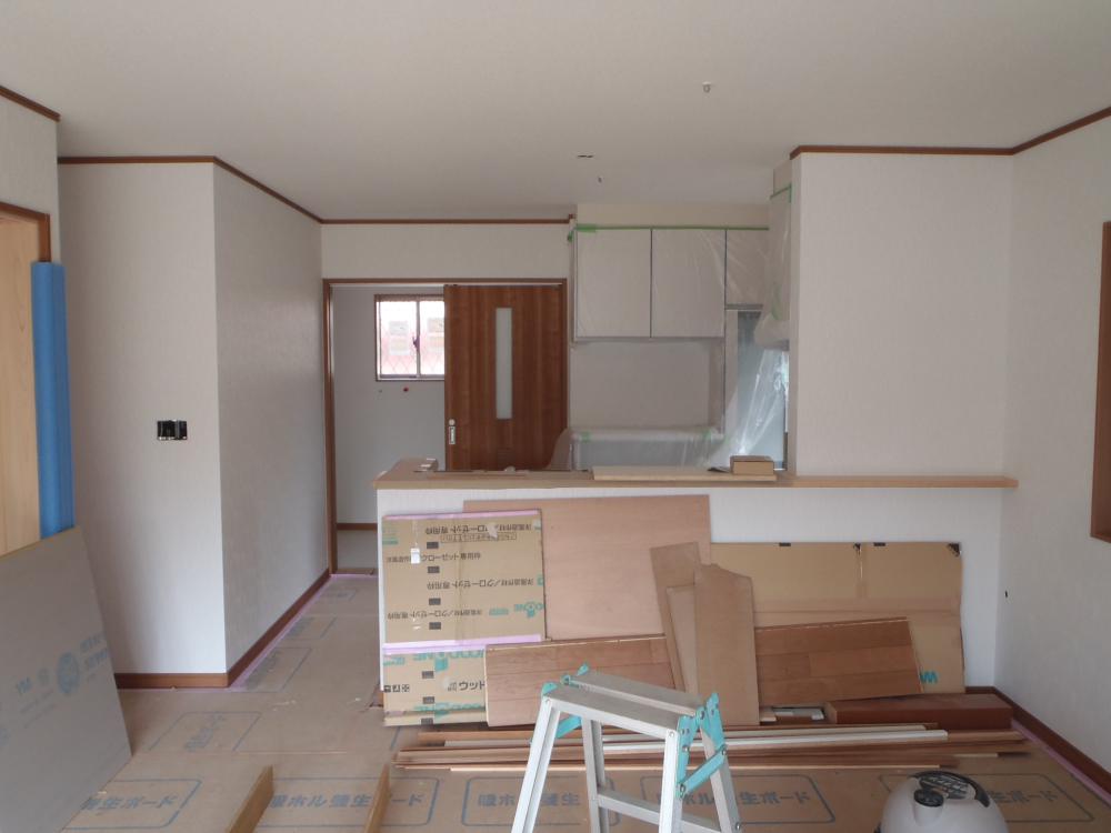 ・外部工事、基礎幅木モルタル塗り・勝手口造成、玄関 ポーチタイル貼り、エコキュート据付を行いました。 ・内部・内装クロス貼りが完了し、衛生器具、電気プレート類 取付と進めています。