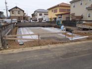 ・基礎工事、掘削・砕石地業を終え、土間シート敷き、 ベース部型枠組みが完了しますと保証機構JIOによる 配筋検査(鉄筋組み状況、鉄筋とのコンクリートとの間隔 など)を受けベースコンクリート打ちを行いました。