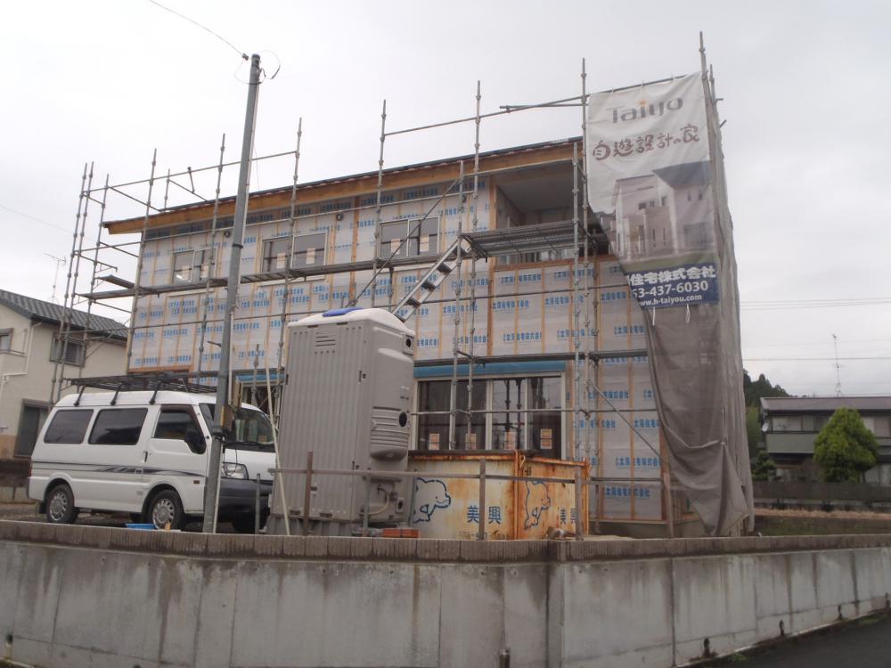 ・木工事、外壁下地、軒天下地組み及び軒天ボードを貼り終え