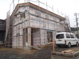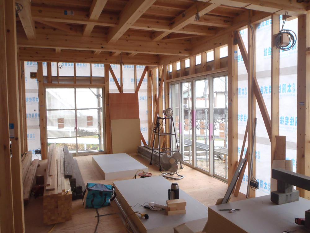 木工事(壁断熱材入れ、2階床下地ボード敷き、1階天井下地