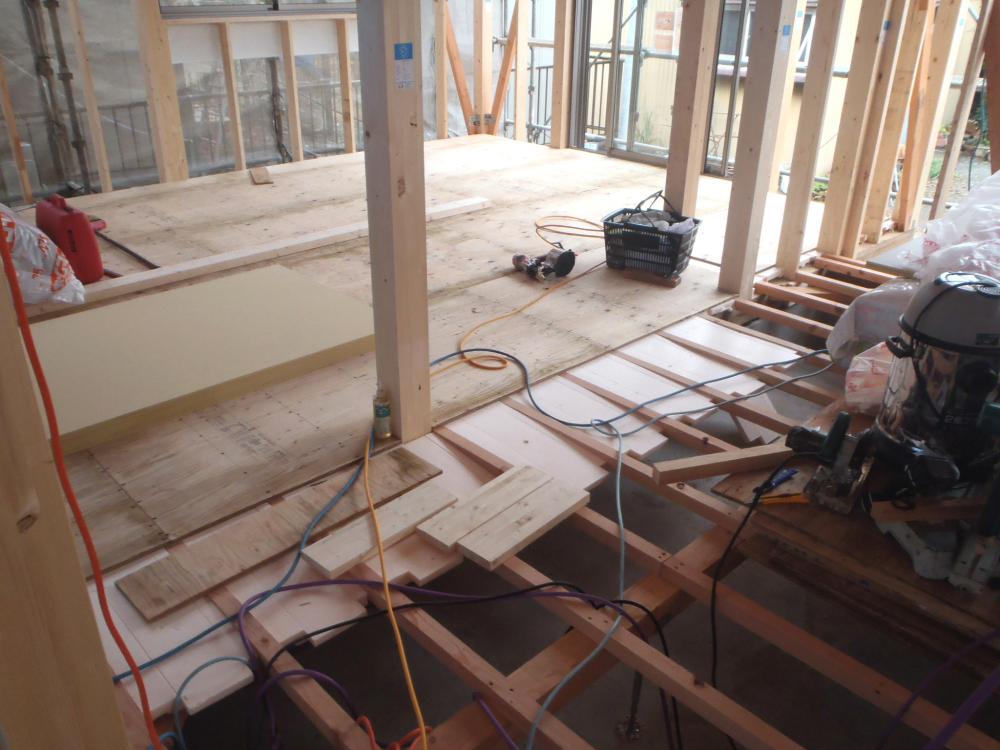 床下地材を本締めし、床断熱材入れ、下地合板貼りと