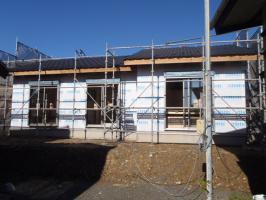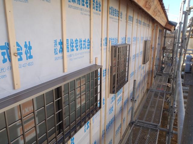 ・木工事、天井下地組み及びボード貼りを終え壁断熱材入れ 外壁下地材打ちを終え軒天板材貼り、床フローリング貼りと 進めています。 ・窓枠材・建具枠材が搬入され順次取付を進めていきます。