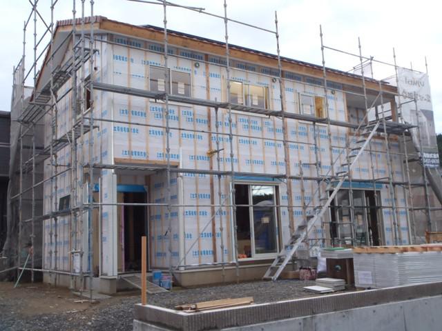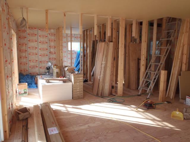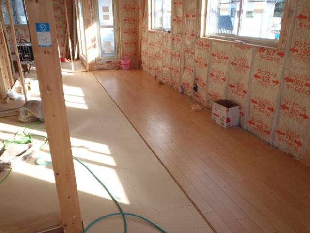 ・木工事、壁断熱材を入れ終え、2階より床フローリング貼りに