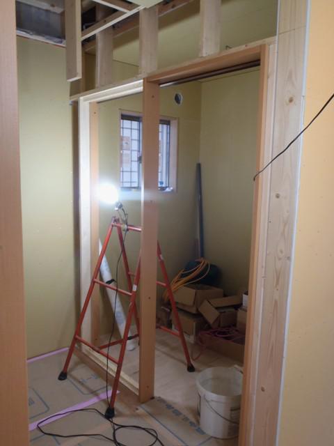 ・内部木工事、ドア開口枠取付、壁ボード貼りが進み、各部屋が