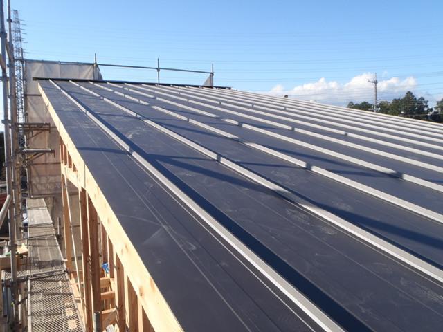 屋根ガルバニューム鋼板葺きが完了し、構造金物取付、窓サッシ