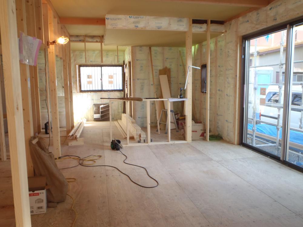 ☆先週の工事☆ 木工事(天井下地組み及び天井ボード貼り、軒天ボード貼り 窓枠取付、床フローリング貼り、他) 内部電気配線・配管 保証機構JIO、外装下地検査 ☆今週の予定工事☆ 木工事(床フローリング貼り、壁ボード・下地合板貼り、 ドア開口枠取付、他)
