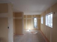 ・内部木工事、棚類取付、幅木・廻し縁取付、建具吊り込みと 進めています。内装仕上げ工事も並行し、クロス下地パテを 進め、木工事を終えた部屋より天井・壁クロス貼りを進めて います。
