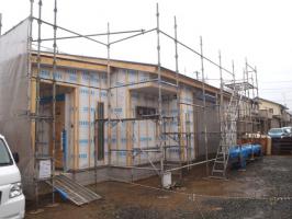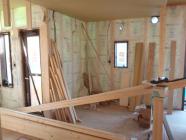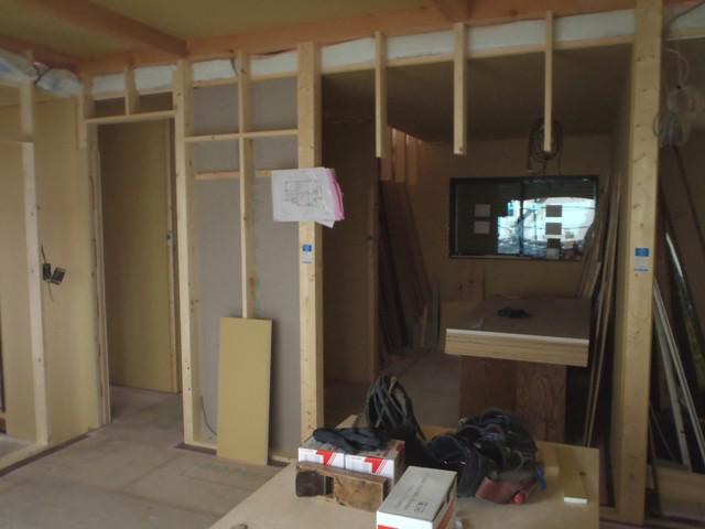 ・内部木工事、窓枠・ドア開口枠Yを開口枠を取付ながら、壁 ボード・壁下地合板貼りを進め、各部屋が間仕切られていき ます。来週、半ばより外壁サイディング搬入工事へと入っていき ます。