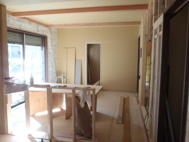・内部木工事、ドア開口枠を取付ながら、壁ボード貼りを進め