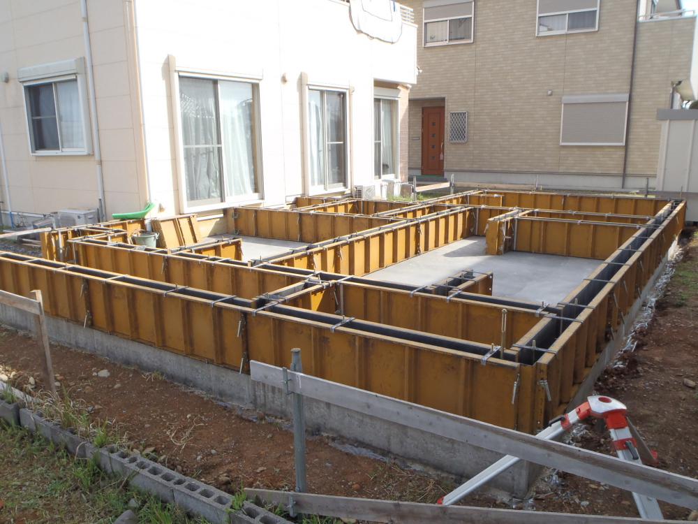 ・基礎工事、立ち上がり部コンクリートを打ち、型枠解体、玄関・ ポーチタイル及び浴室下地コンクリート打ちを進めています。 ・基礎廻り掘削部の埋め戻し基礎工事完了となり上棟に向け 構造材・下地木材搬入、土台据え、床下地組みと準備を 行います。