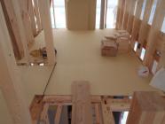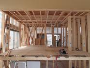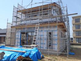・木工事、1階天井下地組み及び下地ボード貼りを終え、外壁 下地材打ちに取り掛かりました。 ・軒天下地組み、、ケイカル板貼りと外部造作を予定して います。天候により内部造作、窓枠取付、壁断熱材入れなど を進めていきます。