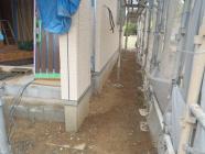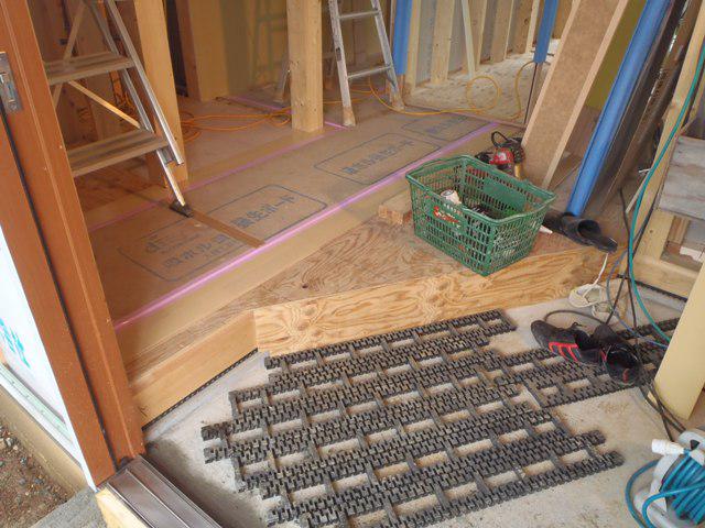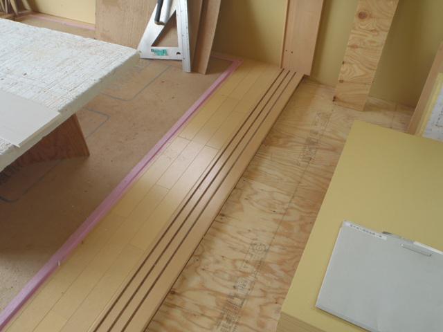 ・外壁工事、スタート金物・角コーナー材を取付、平板サイディング 貼りを西・北面と進めています。 ・内部木工事、床フローリングを貼り、建具枠取付ながら壁ボード材 下地合板を貼り進め各部屋が間仕切られてきました。