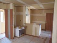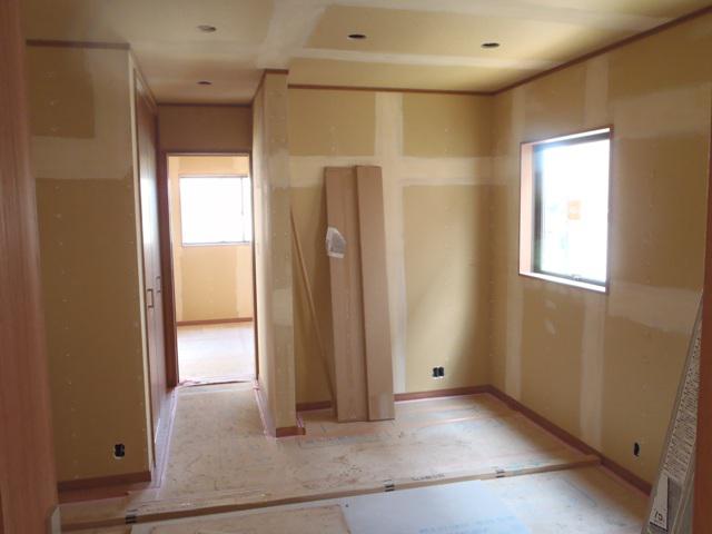・外部足場が解体され、建物外観がよく確認出来るようになり、 外部給排水埋設を進めていきます。 ・内装クロス下地、ボードジョイント部、ビス穴をパテ入れを行い クロス材が綺麗に貼れるよう処理を行っていきます。