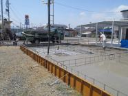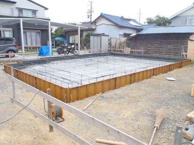 ・基礎工事、ベース型枠組み、鉄筋組みが完了し保証機構JIOに よる配筋検査(規定鉄筋組み、コンクリートと鉄筋の間隔などを 検査)を受けベースコンクリートを打ち終えました。基礎立上り部 型枠、アンカーボルト類設置し立上り部コンクリート打ちと進めていき ます。