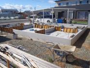 ・基礎工事、立ち上がり部コンクリートを打ち、型枠解体、玄関・ ポーチタイル及び浴室下地コンクリート打ち、基礎廻り掘削部の 埋め戻し整地し基礎工事完了となりました。 ・上棟に向け、構造材・下地木材搬入、土台据え、床下地組み と準備を行います。