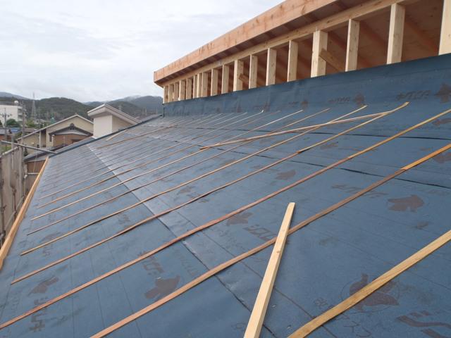 ・翌日、屋根下地の続きを行い、ルーフィング材を葺き屋根下地を