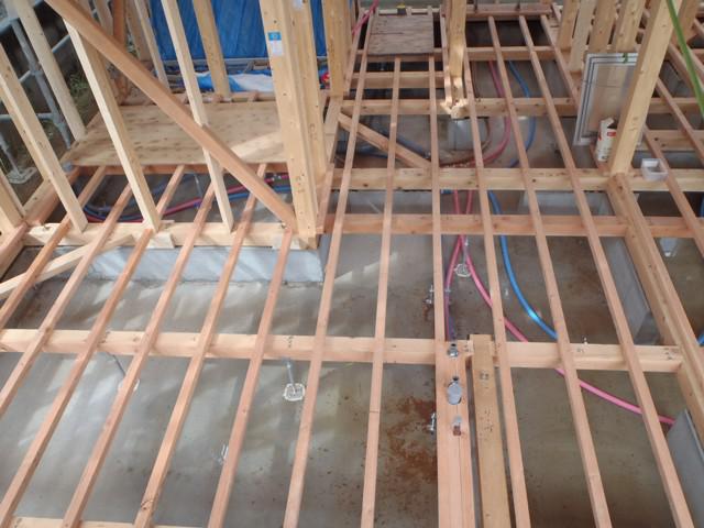 ・屋根瓦葺き、防腐・防蟻処理を行い、保証機構JIO及び検査 機構による中間検査を受けます。1・2階床下地、1階床 断熱材入れ、ユニットバス下地を行い29日ユニットバス 部材を行います。