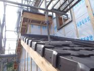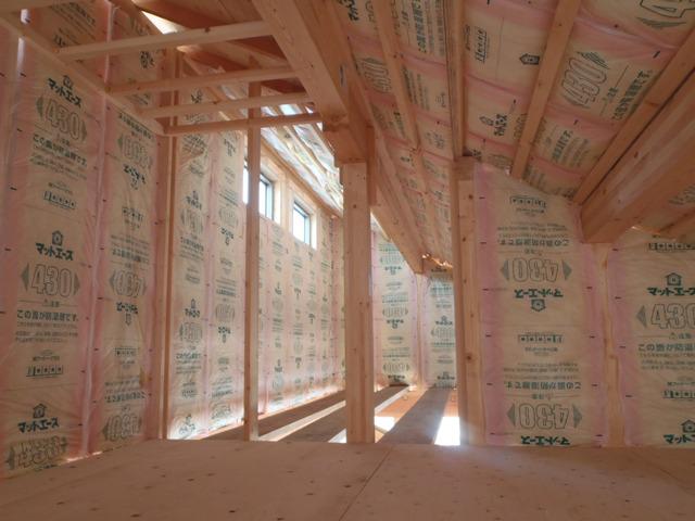 ・外壁シート貫通部の防水処理を行い、12日保証機構による 最後の検査(外装下地)を受け保証書が発行されます。 ・内部電気配線・配管が進み、天井下地組み、天井断熱材 天井ボード貼りへと木工事進めていきます。