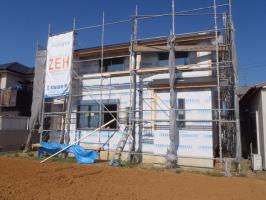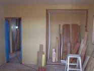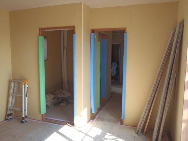 ・木工事、2階天井下地組み及び天井ボード貼りを終え、1階壁 ボード及び下地合板貼り、床フローリング貼りへと入りました。 ・2階も同様、壁ボードを進めながら、ドア開口枠取付も進めて いきます。