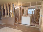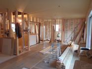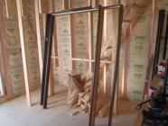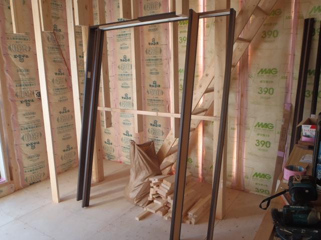 ・外壁サイディング材が搬入され、コーナー部材取付後、平板 サイディング貼りを進めていきます。 ・木工事、窓枠材を取付、床フローリング貼り、ドア開口枠組立を 進めています。床貼り後、壁ボード及び下地合板貼り、 ドア開口枠を行います。