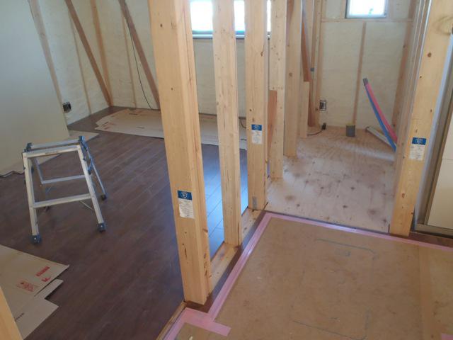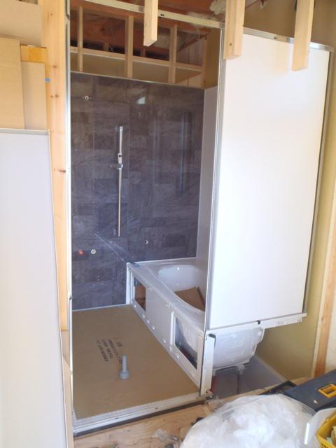 ・木工事、和室床下地組み、床フローリング貼りを終え、窓枠取付に 取り掛かりました。 ・窓枠を取付した壁よりプラスターボード及び下地合板貼りへと 入ります。 2日、ユニットバス据付完了しました。
