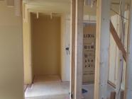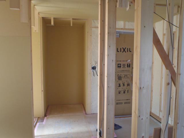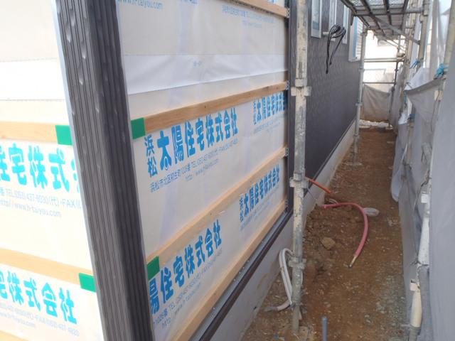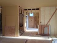 ・木工事、壁ボード及び下地合板貼りを進めながら、ドア開口枠 を取付けています。 間仕切り壁がふさがれ各部屋の間隔が一段と分かるように なりました。 ・外壁サイディング材が搬入され、貼り始めのスタート金物、角 コーナー部材が取り付けられ、平板サイディング貼りに入ります。