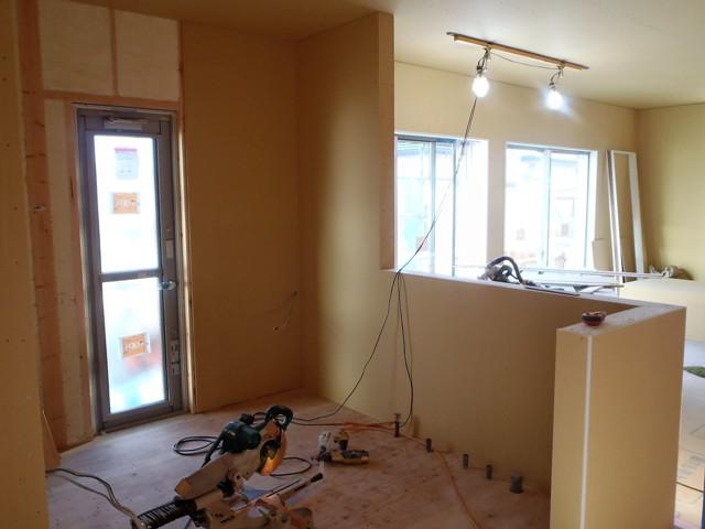 ・内部木工事、ドア開口枠を取付ながら、壁ボード及び下地