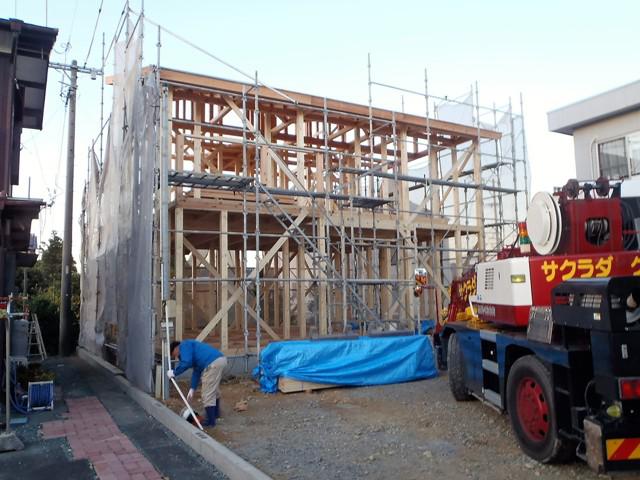 ☆先週の工事☆ 基礎工事(立上り型枠解体、埋め戻し整地、他) 構造材、下地木材搬入 上棟準備 上棟 先行足場組み ☆今週の予定工事☆ 屋根下地材葺き 木工事(筋カイ入れ、構造金物取付)