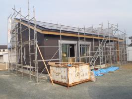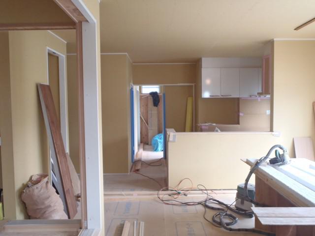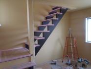 ・外部工事、サイディングコーキング打ち、軒天塗装完了し、板金工事 へと進めていきます。 ・内部木工事、小屋裏・壁ボード貼り、階段造作を終えました。 カウンター・笠木類取付、棚類取付、和室天井仕上げ材貼りを 行っていきます。