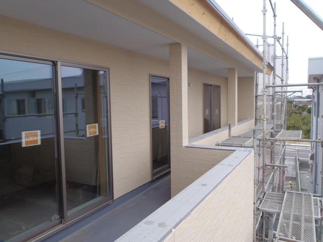 換気扇フード類・電力引込金具を取付、外部足場解体となり